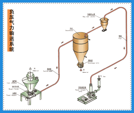 正負壓稀相輸送,料氣比大約為0~30,為粒體懸浮于氣流中,可根據(jù)正負壓各自輸送距離與產(chǎn)量來合理選定出動力源風(fēng)量與風(fēng)壓,亦可根據(jù)不同工況,組合成不同形式的正負壓一…